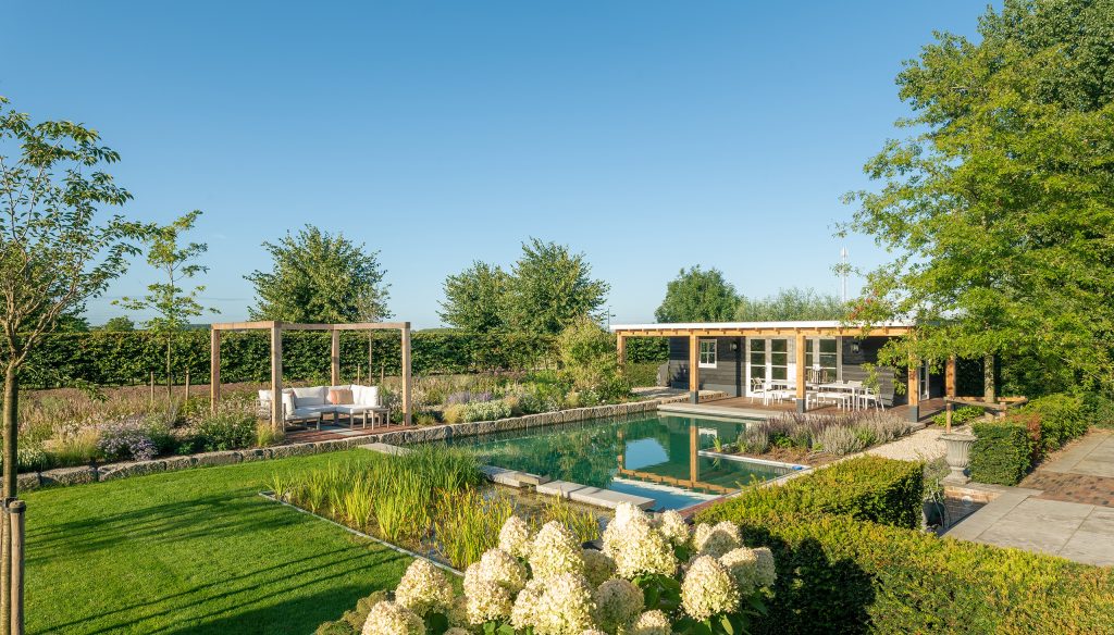 Aansluitend op het ontwerp van deze tuin hebben we een royale tuinkamer gerealiseerd. Op de wat koudere dag is het in de tuinkamer zelf goed vertoeven en op zonnige dagen is het met uitzicht op de zwemvijver zelfs ’s morgens al heerlijk wakker worden met een kop koffie op de veranda van dit buitenverblijf.