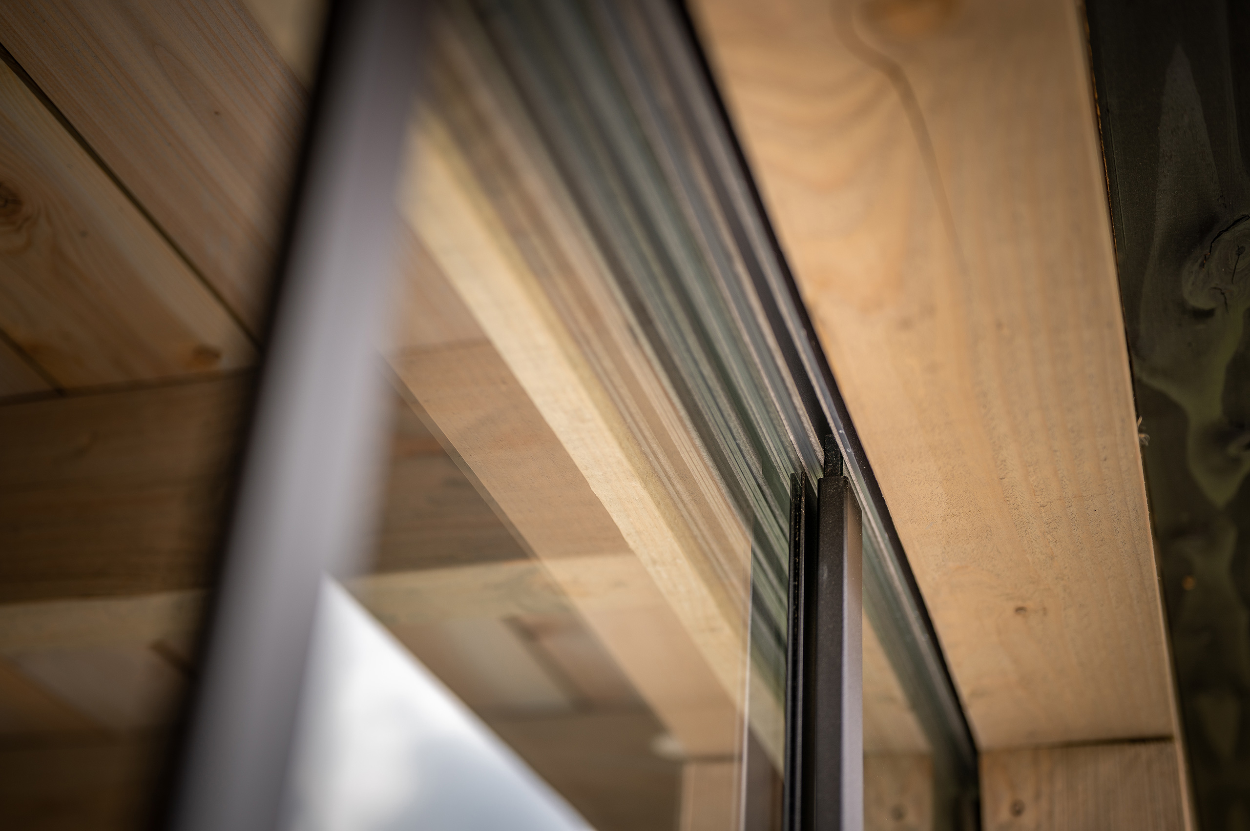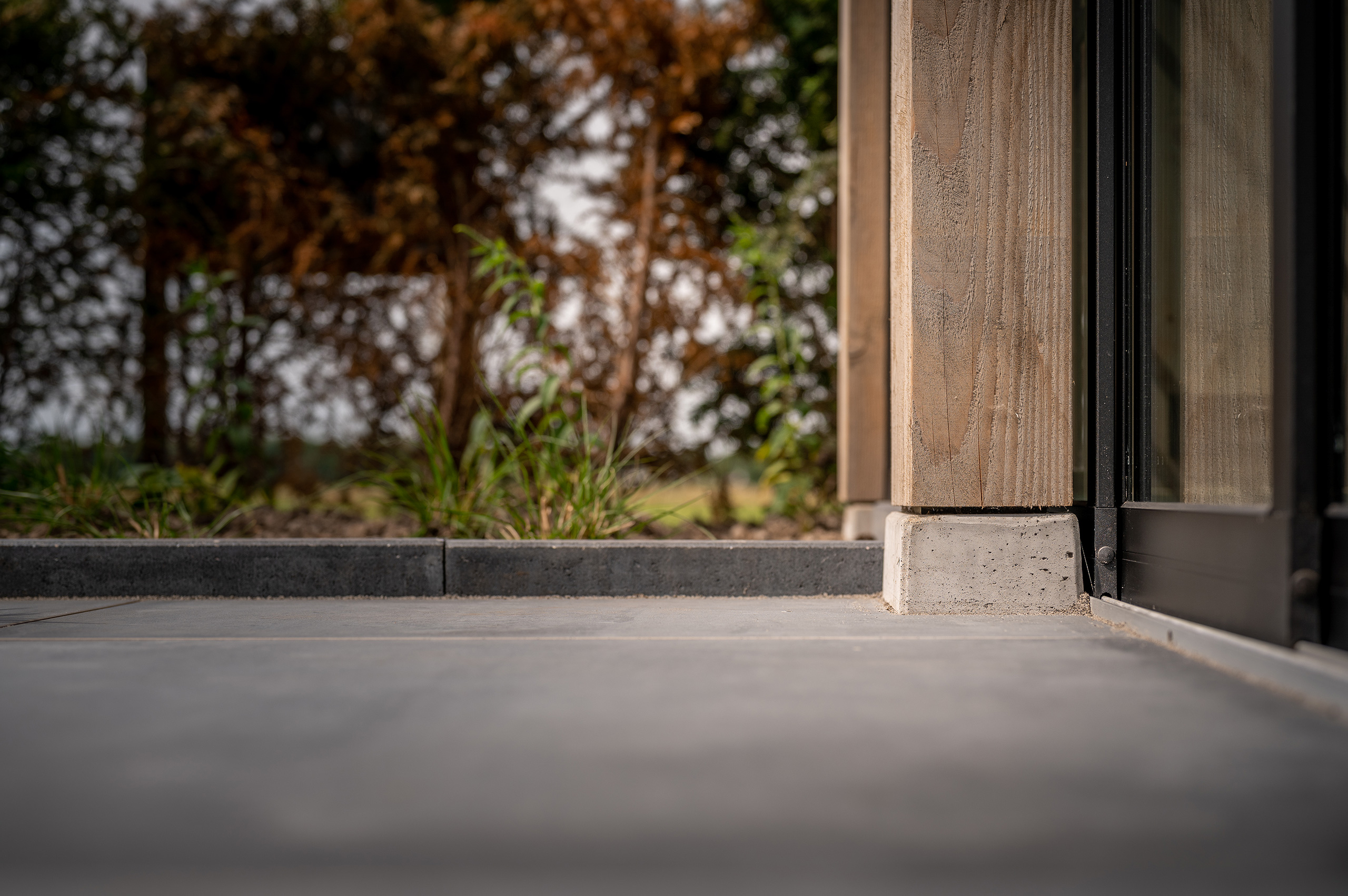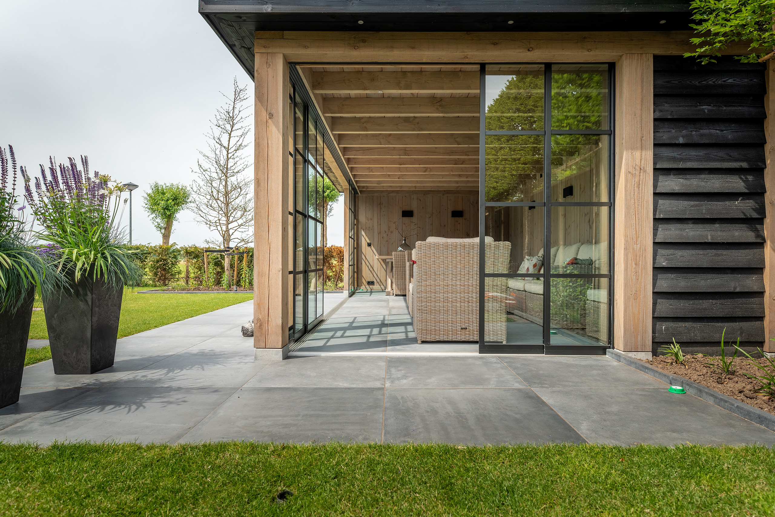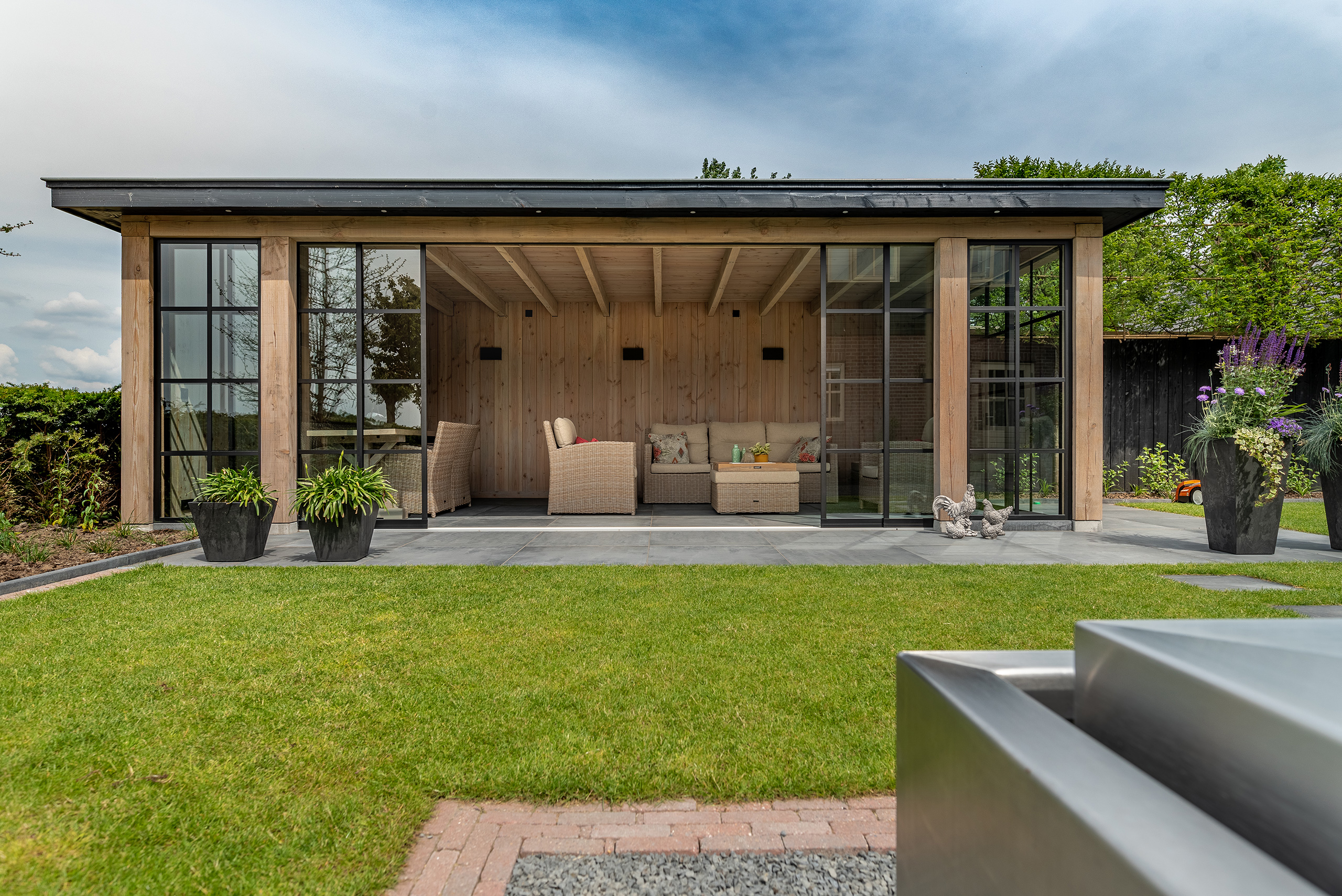 In deze moderne tuin is deze strakke tuinkamer een perfecte match. De donkere boeidelen steken mooi af tegen het geloogd douglashout en zijn volledig in stijl met de zwarte stalen schuifpui.