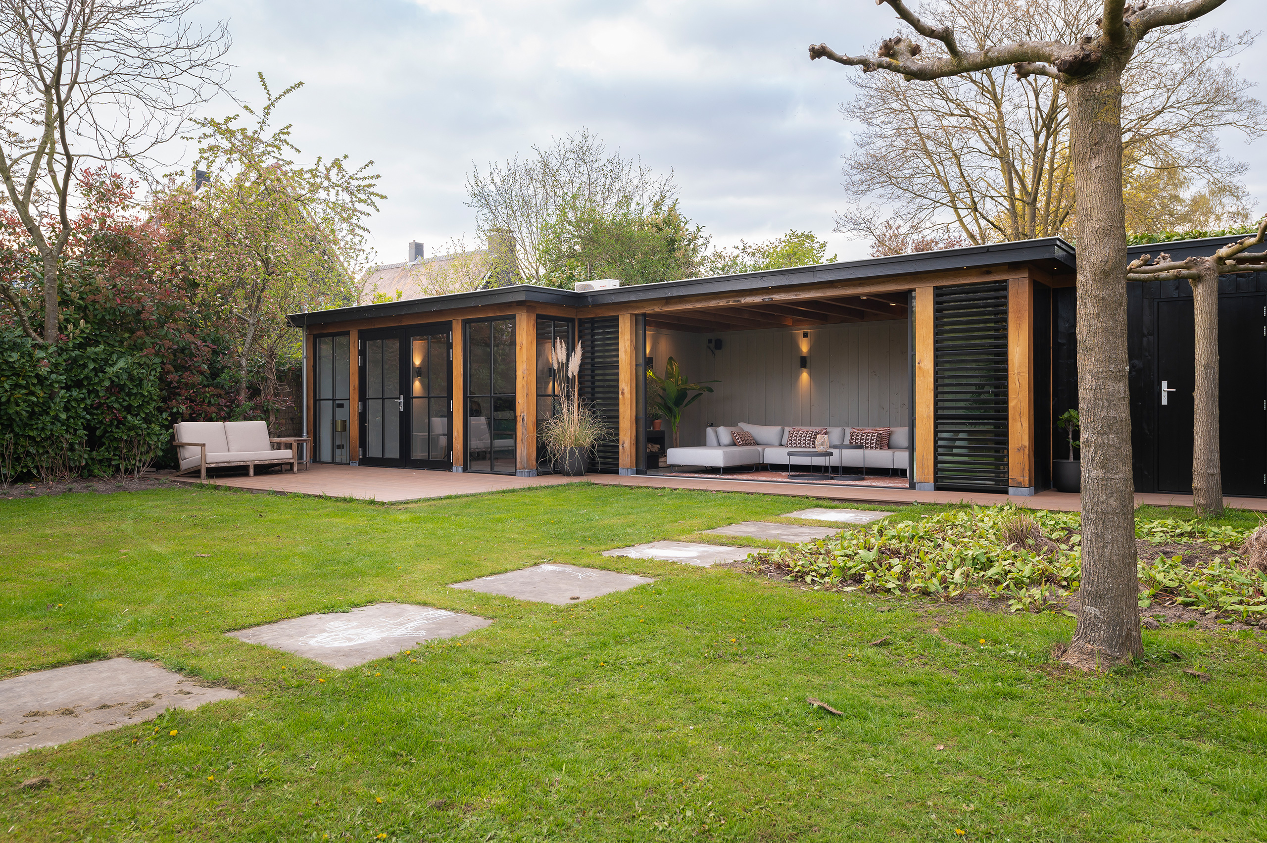 Dit voltooide project in Utrecht omvat een luxe buitenverblijf met een tuinkamer, werkruimte en schuur, allemaal ontworpen om aan de specifieke behoeften van de klant te voldoen. De prominente kenmerken zijn de eikenhouten structuur met Stantico stijlelementen en het gebruik van natuurlijke materialen zoals eiken en douglas. Het eindresultaat is een functionele ruimte die esthetisch past bij de levensstijl van de bewoners.