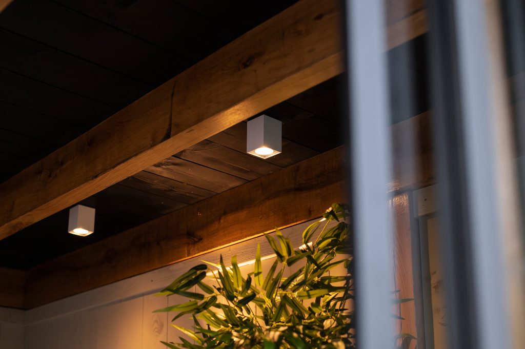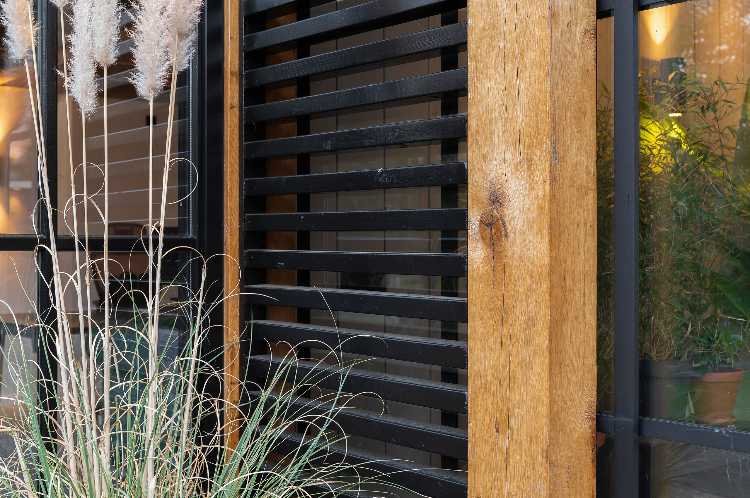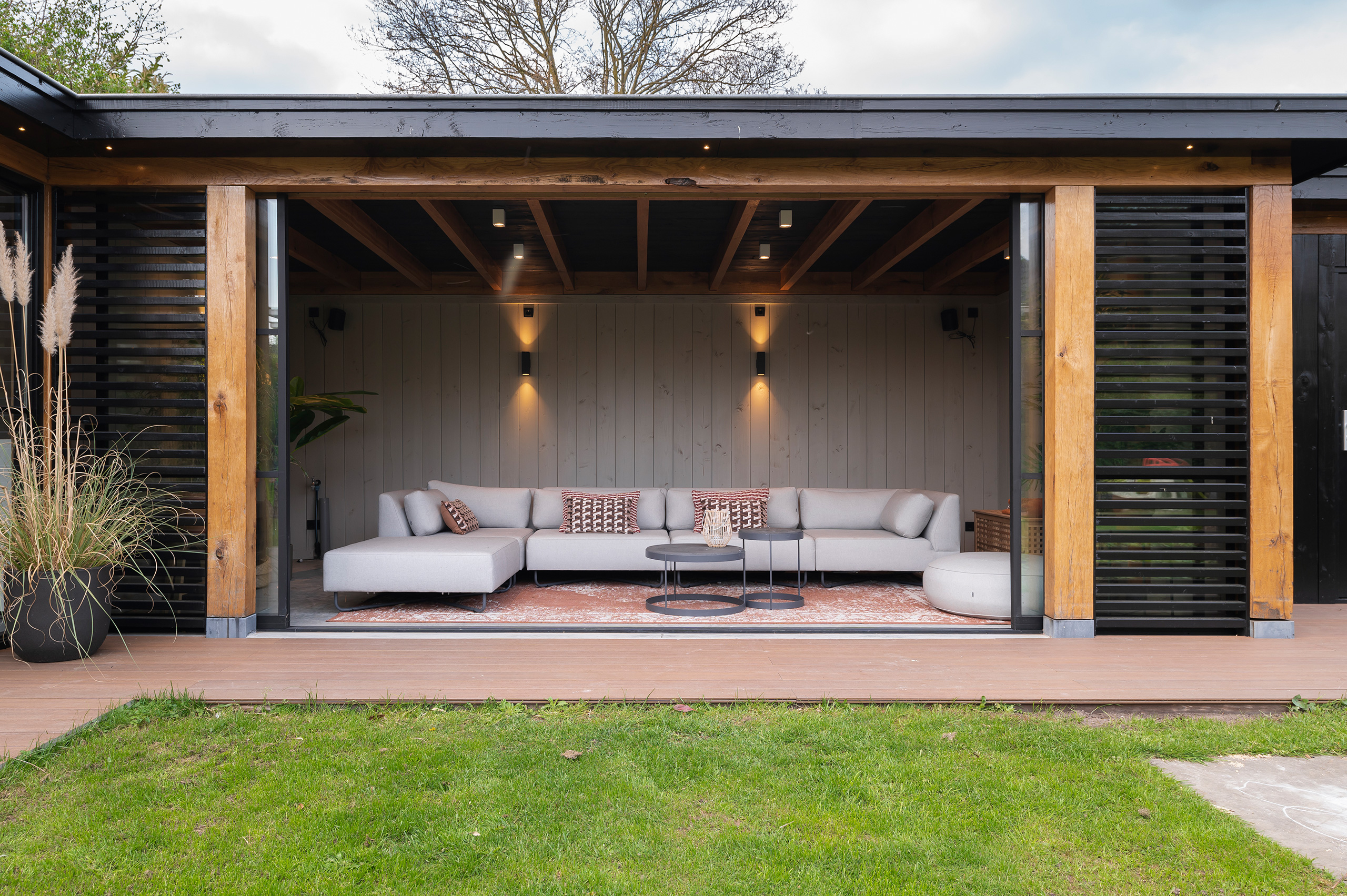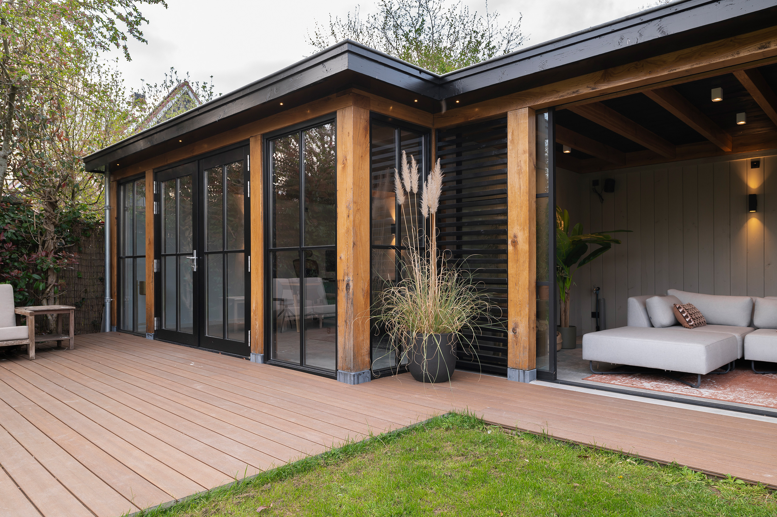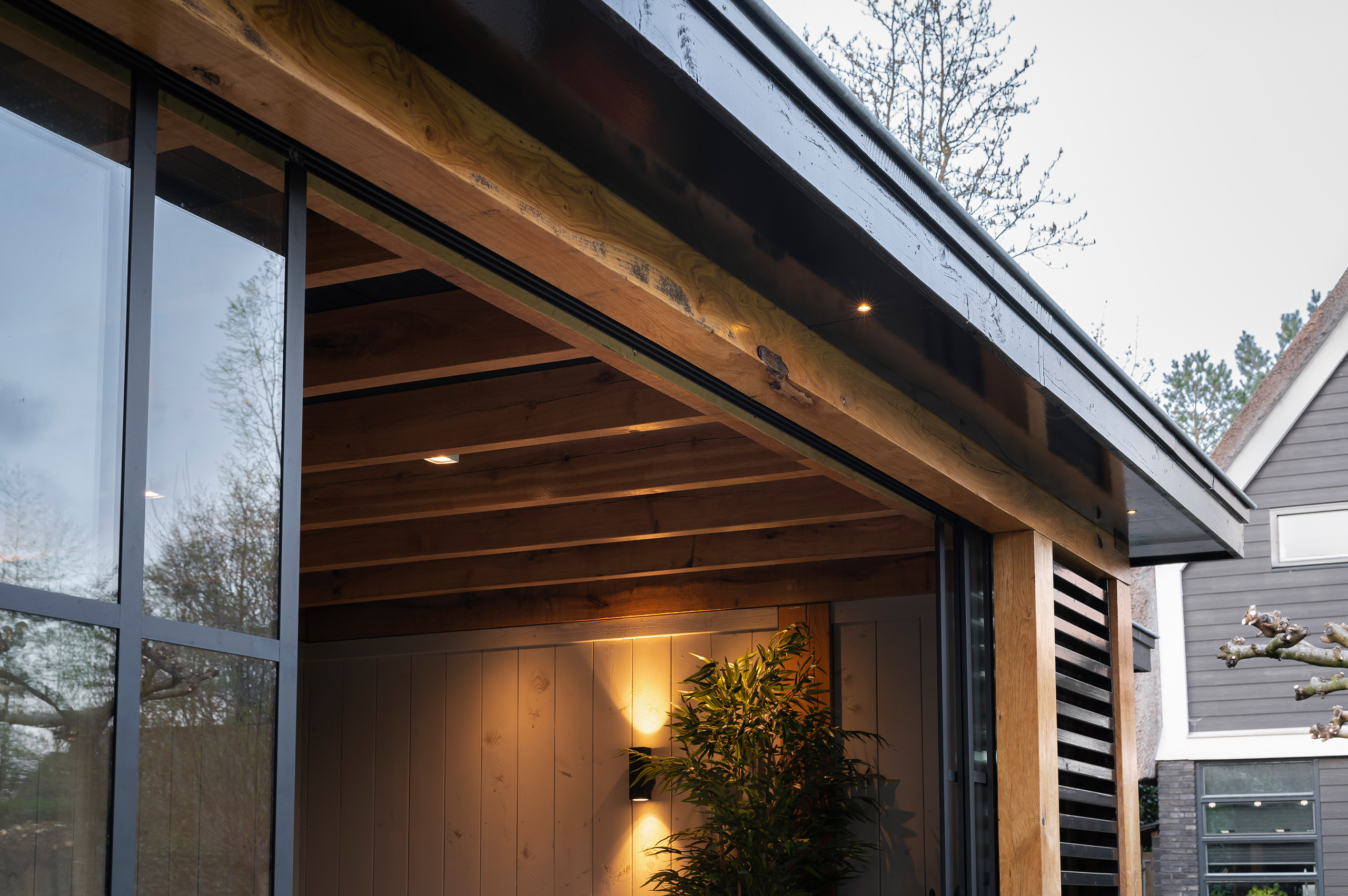 Het tuinverblijf is gebouwd met een eiken gebinte dat een vleugje Stantico stijl toevoegt, zonder de functionaliteit uit het oog te verliezen. Eiken en douglas bekleding dragen bij aan de duurzaamheid en natuurlijke uitstraling van het gebouw. Een vlonder en doordachte verlichting versterken de buitenomgeving en creëren een uitnodigende sfeer.