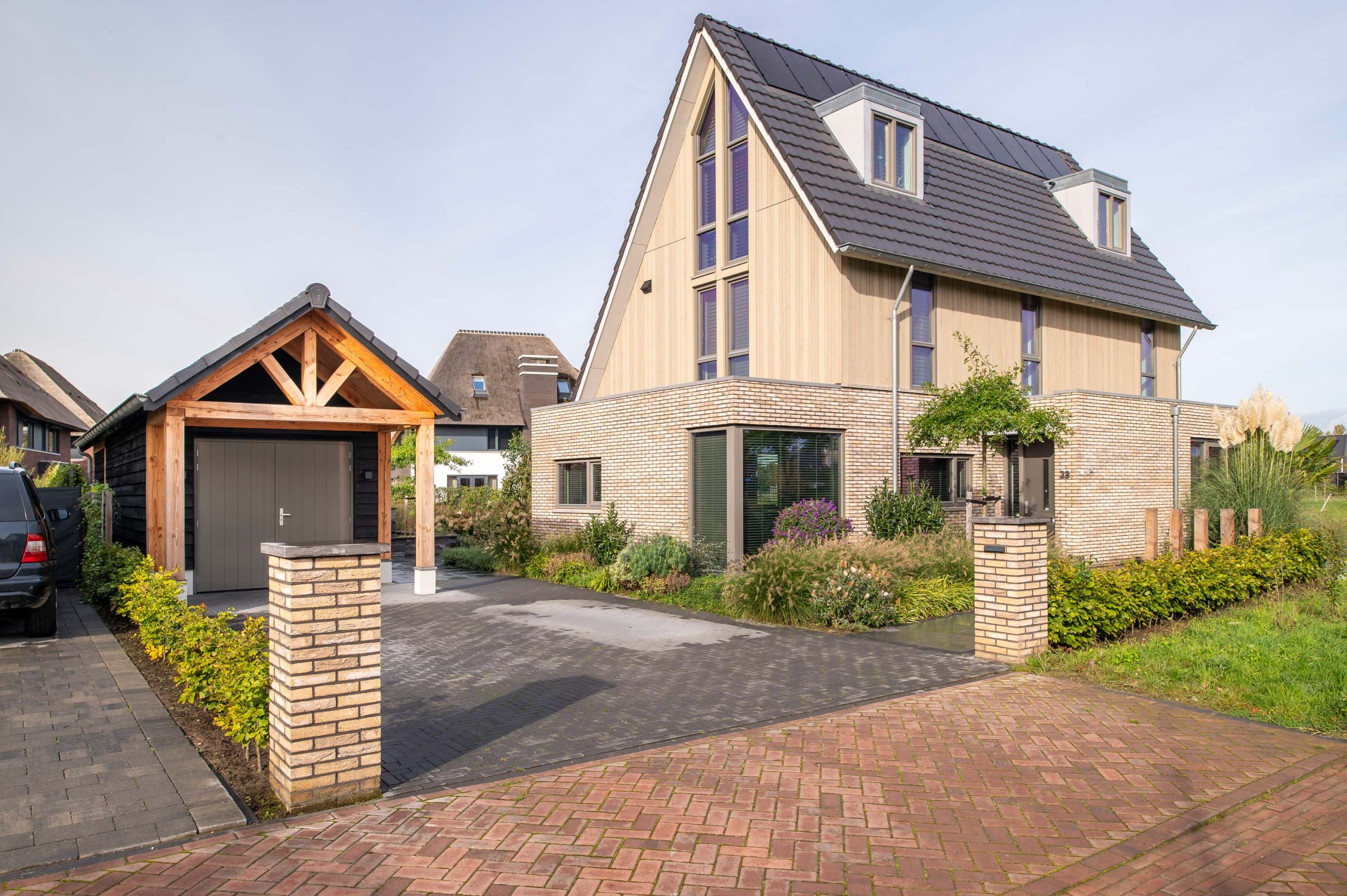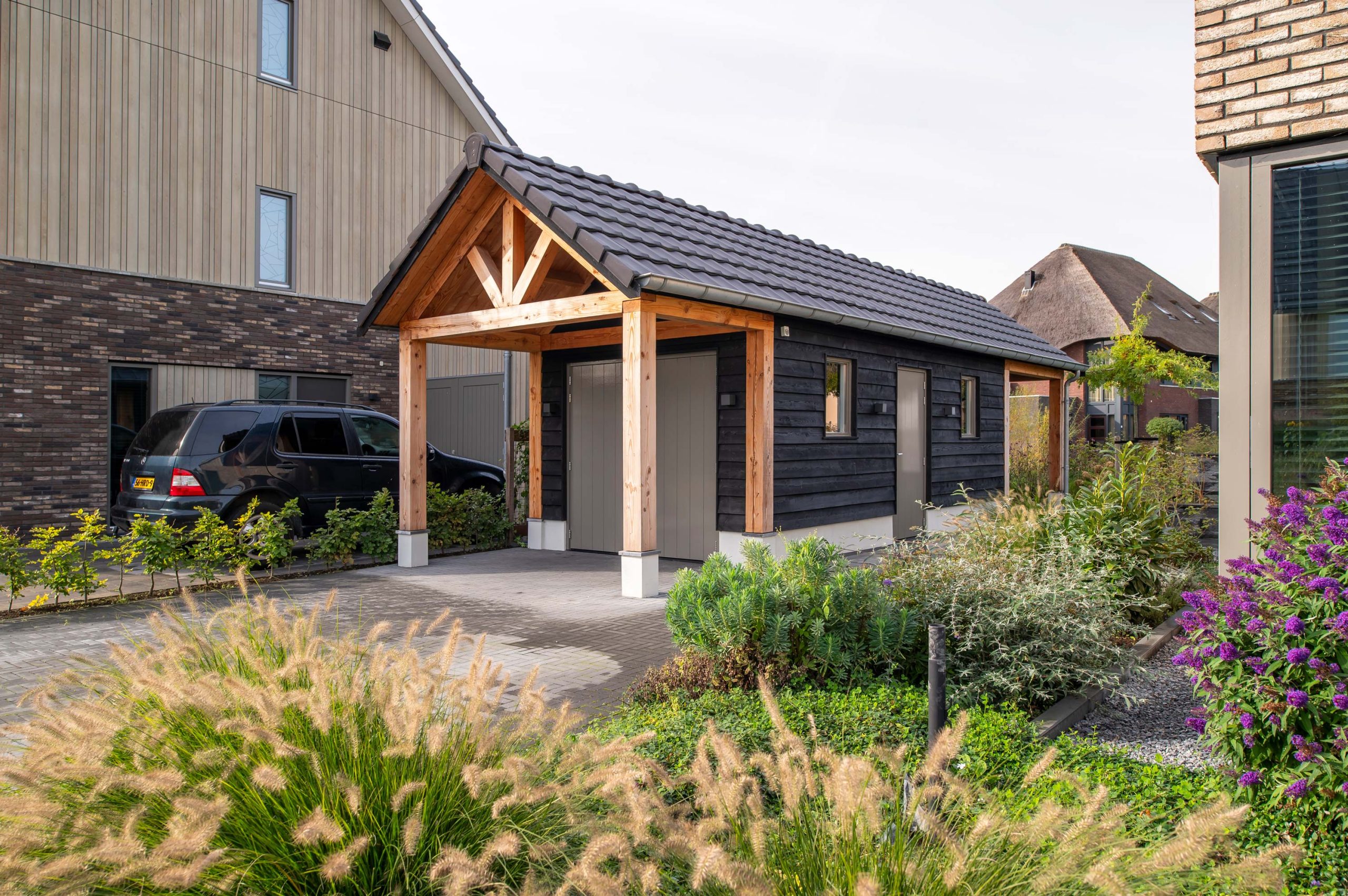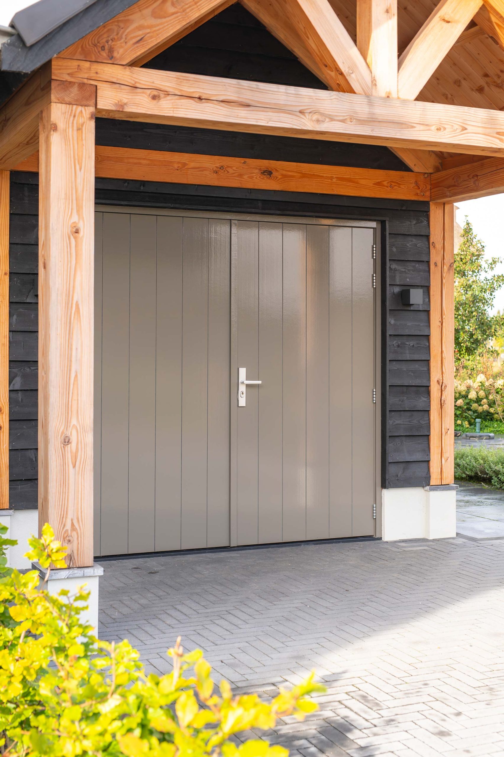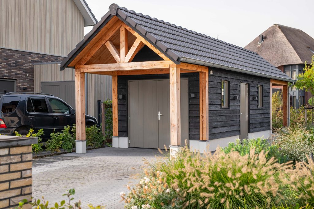 De bewoners van dit huis hadden de wens om een puntschuur op de oprit te realiseren, die doorloopt in de tuin in een veranda. De keuze viel op een puntschuur met veranda. Het gekozen materiaal, douglas hout, kan tegen een stootje en is duurzaam in gebruik. De gestucte borstwering en betonnen vloer passen goed bij het huis en de tuin. Een echte blikvanger! De schuur is geïsoleerd, zodat de spullen binnen goed beschermd zijn tegen bijvoorbeeld vocht.