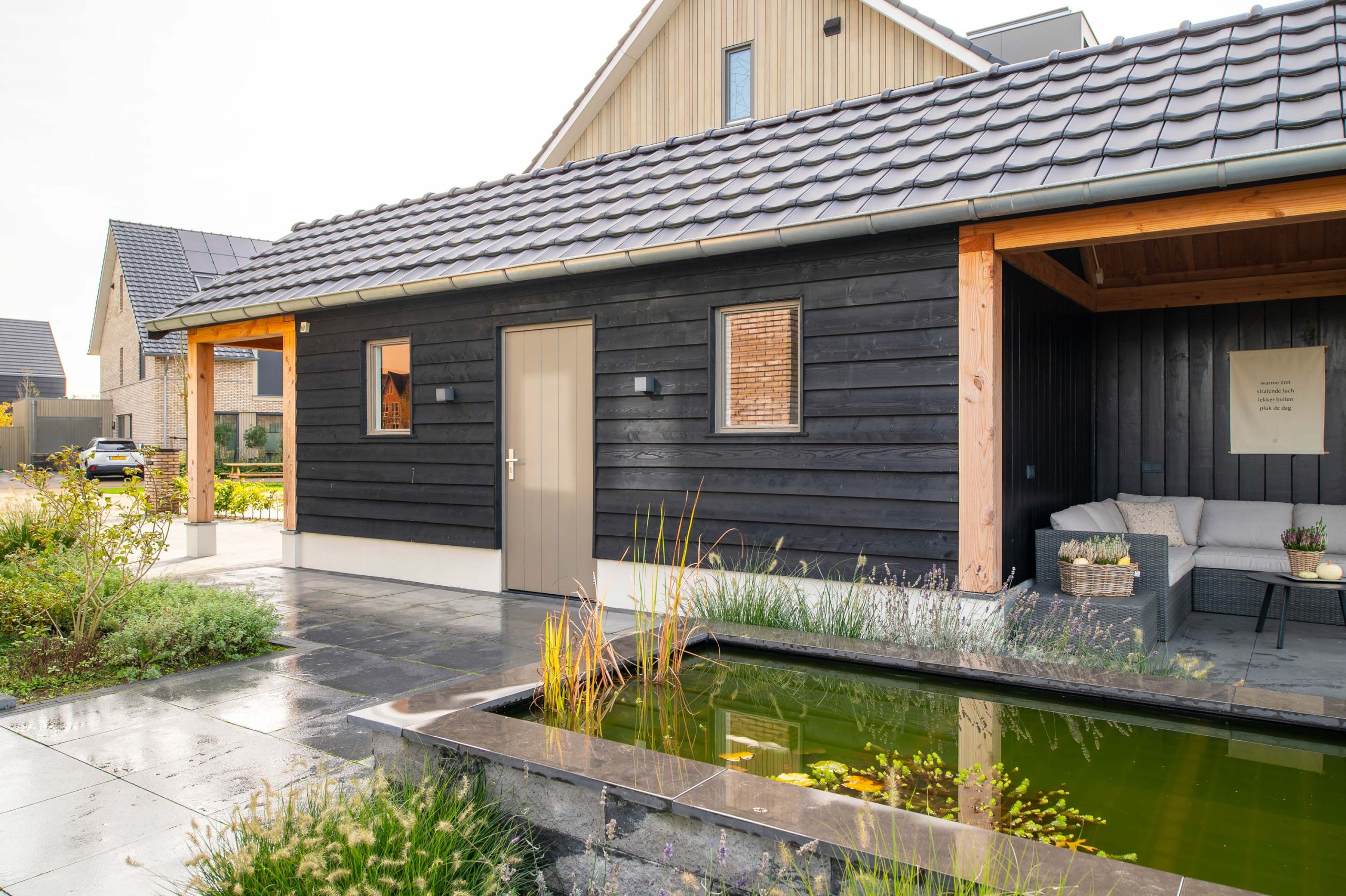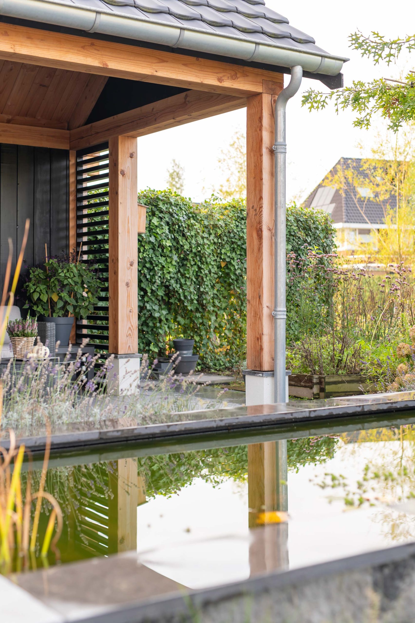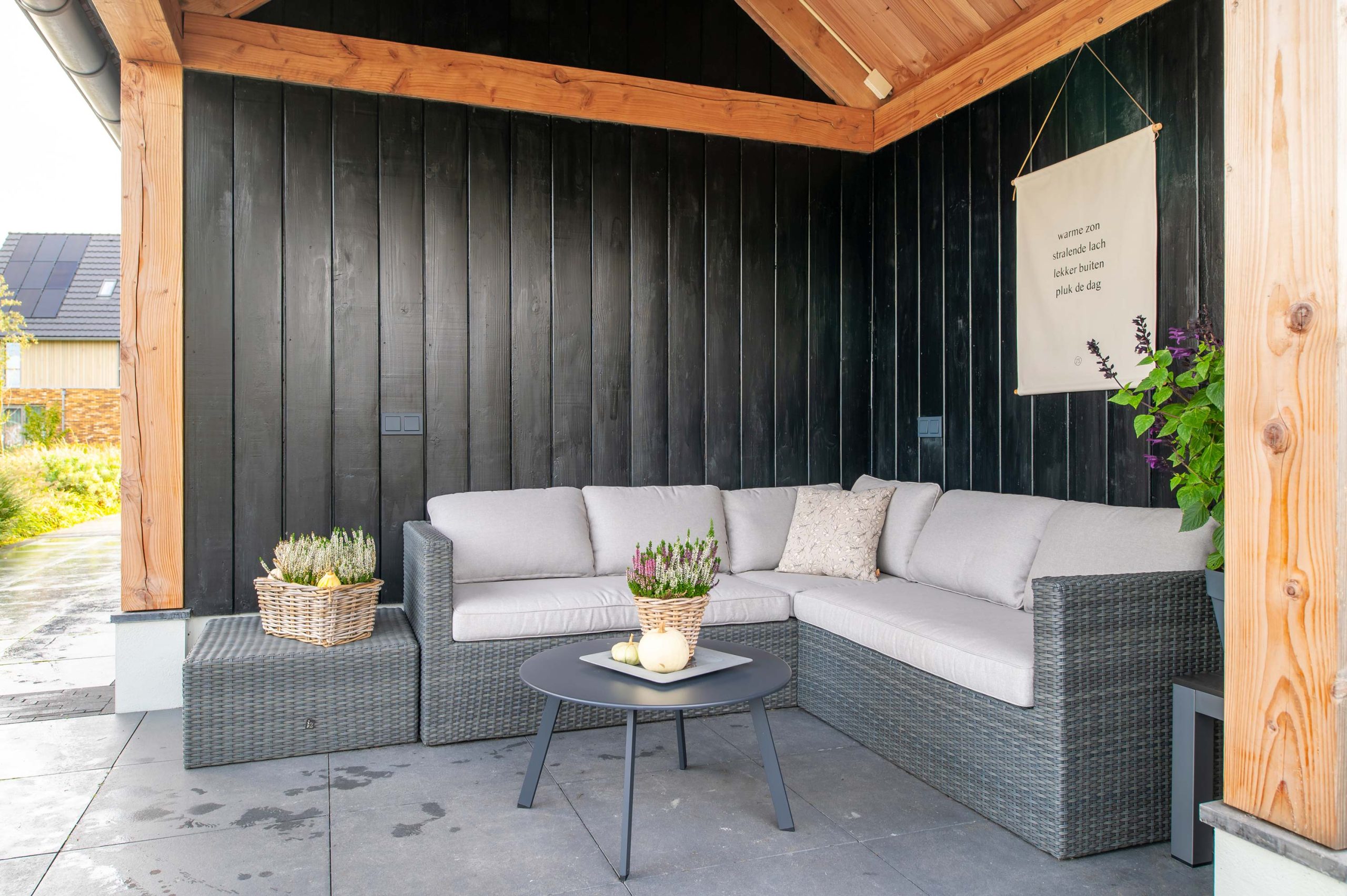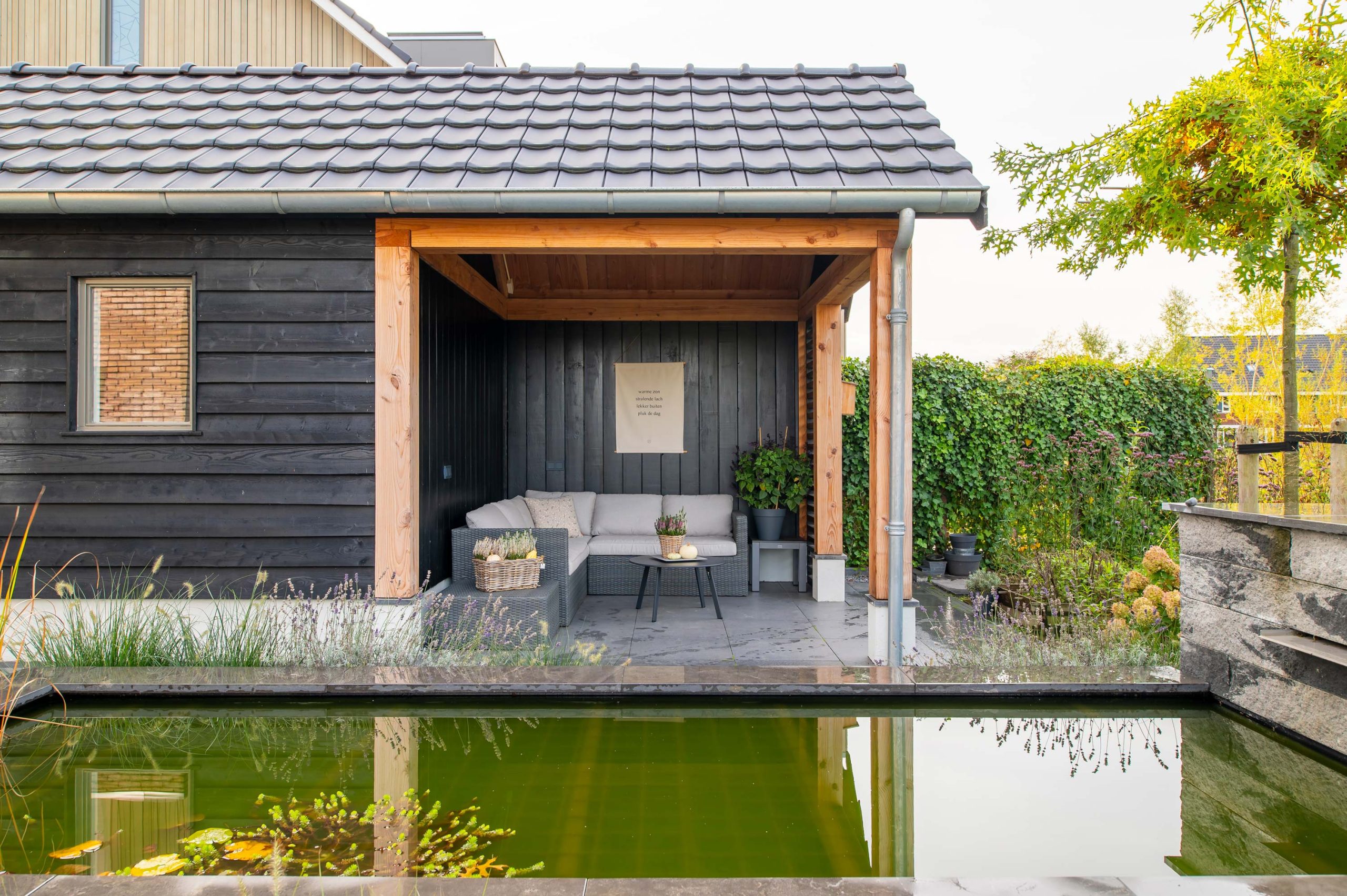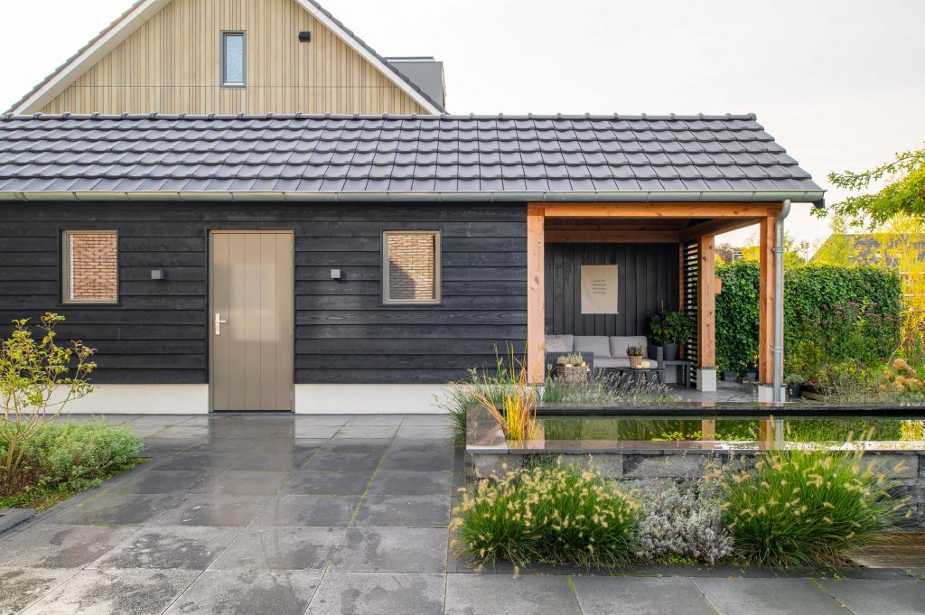 In Nijkerk mochten we aan de slag met een puntschuur en veranda. De ruime schuur heeft een robuuste look, dankzij het douglas hout en de betonnen vloer. Zo past deze goed in het totaalplaatje van het huis en de tuin. Aan de achterkant bevindt zich een veranda die wordt ingezet als loungeruimte. Hierdoor kunnen de bewoners genieten van hun tuin en tegelijkertijd droog of uit de zon zitten.