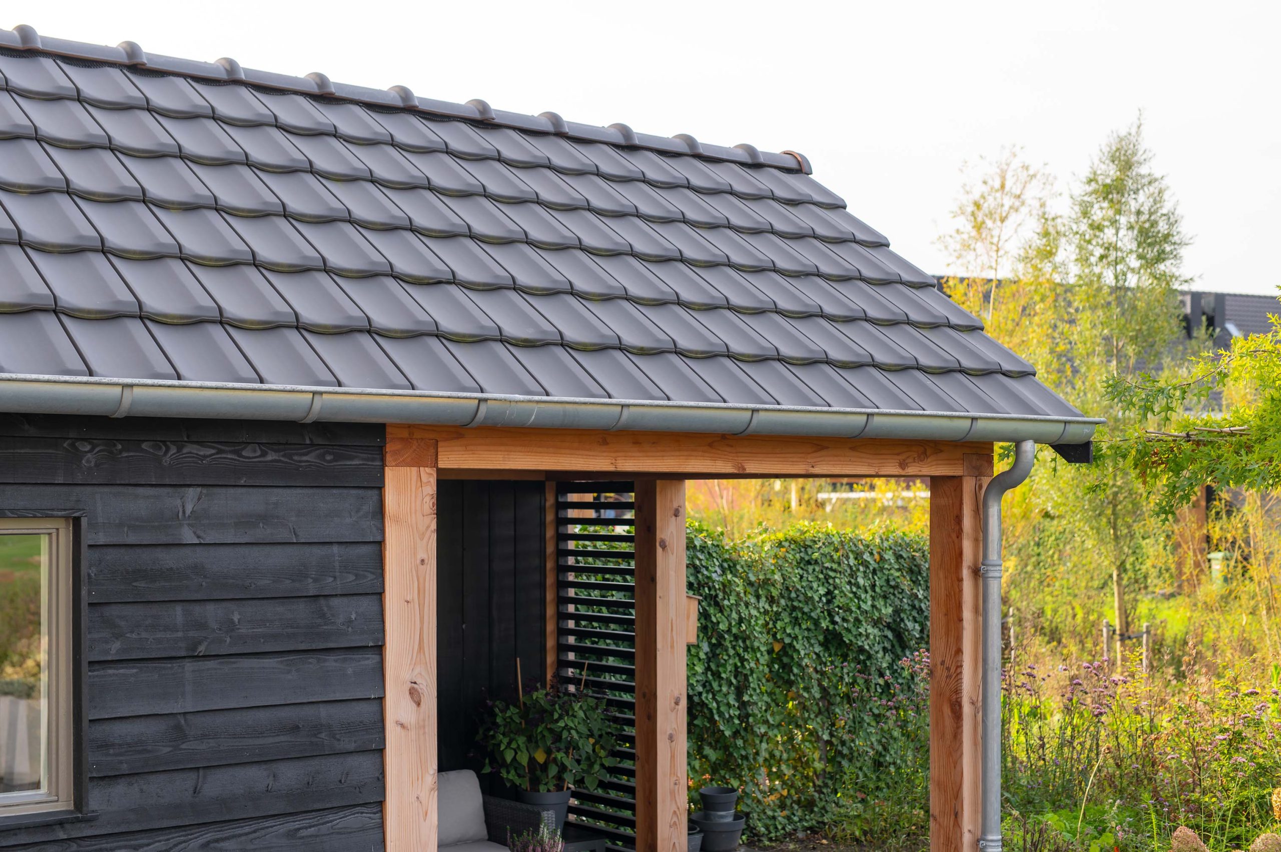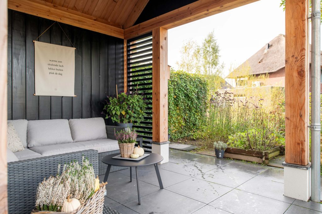 De schuur loopt door in een veranda, zodat er ook direct een extra zitruimte is. Deze ruimte bevindt zich aan de achterkant van de schuur, waardoor er veel privacy is en er tegelijkertijd volop genoten kan worden van de prachtige tuin. Een echte aanwinst voor nog meer buitenleven!