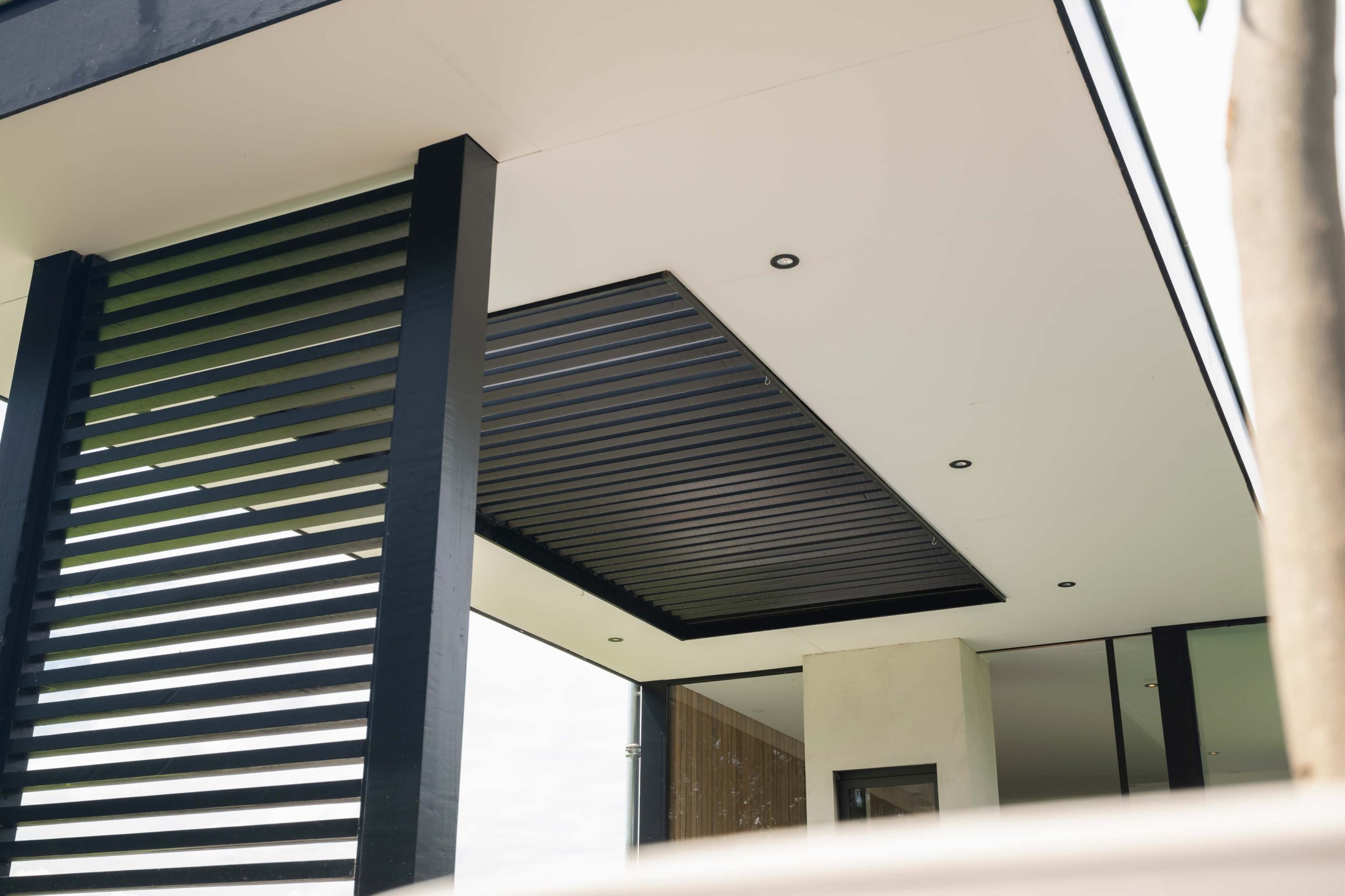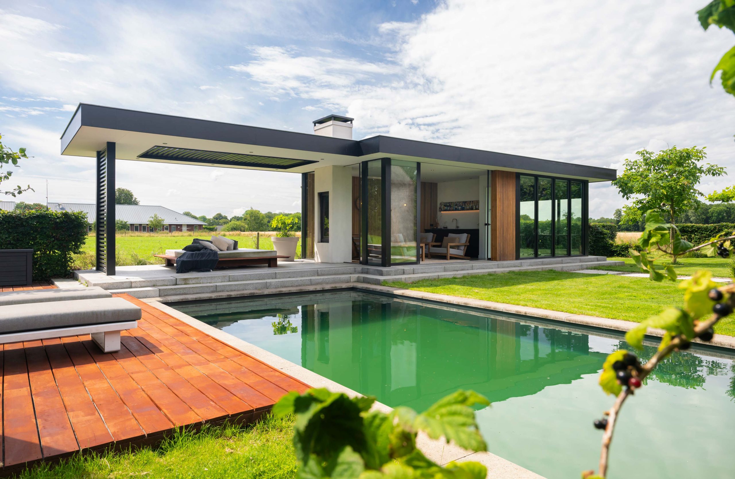 We hebben een aansluitend houten lamellen dak geplaatst aan de tuinkamer. Rondom het hele zwembad is een Bankirai hardhouten vlonder betimmerd.