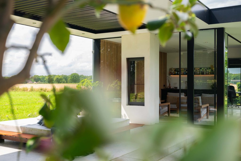 In de tuinkamer bevindt zich een thuiskantoor van 4 bij 4 meter. Zo kan er gewerkt worden met een prachtig uitzicht. Het kantoor is geïsoleerd met vaste kozijnen. Ook heeft de tuinkamer glazen schuifdeuren met aluminium strips en een gestucte doorkijkhaar.