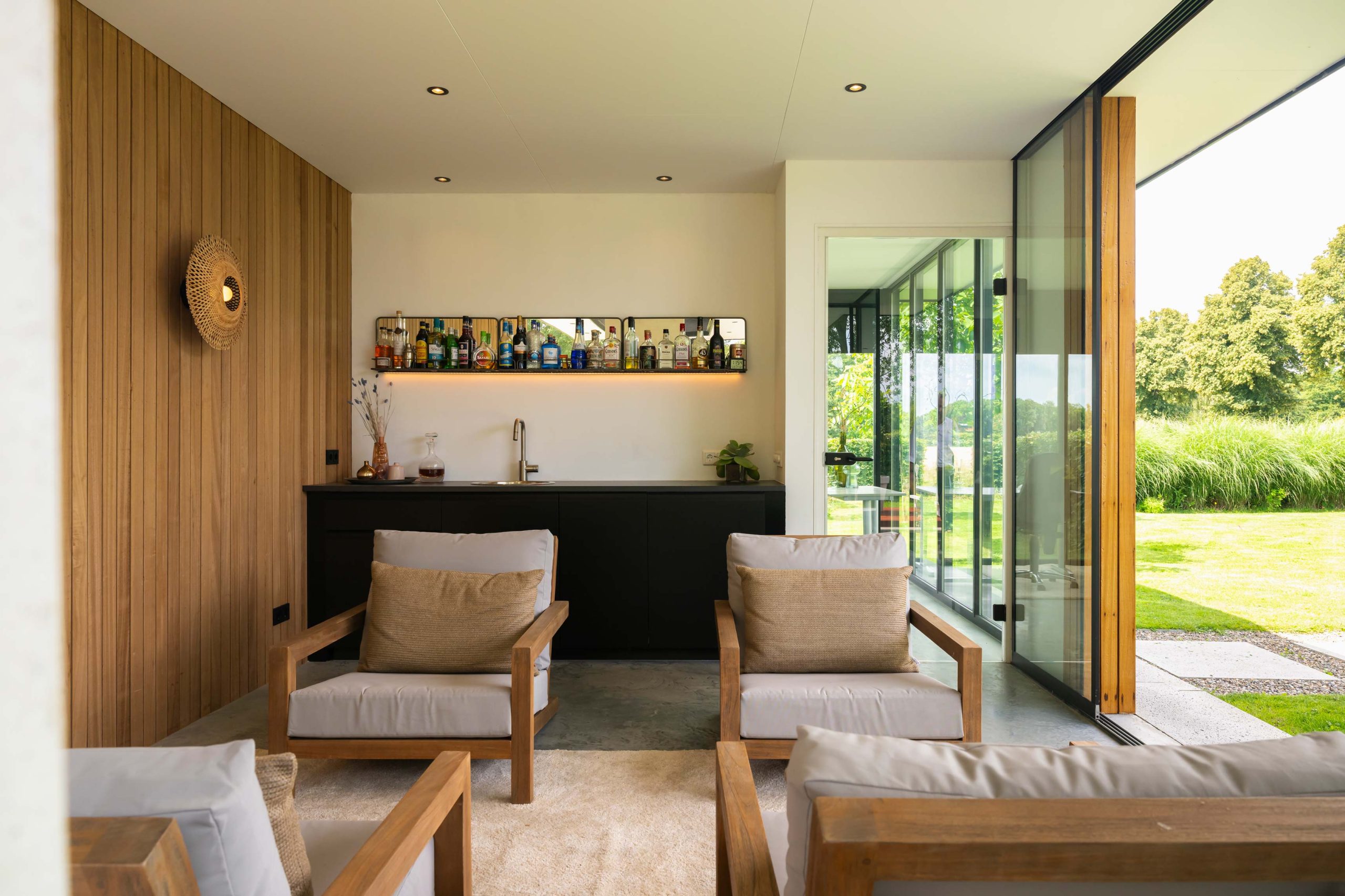 Het loungegedeelte van 5 bij 4 meter zorgt ervoor dat er een heerlijk zitplek is. De achterwand van ayous latten (7 cm breed) geeft de tuinkamer een warme uitstraling. De luifel is 4 bij 3 m.