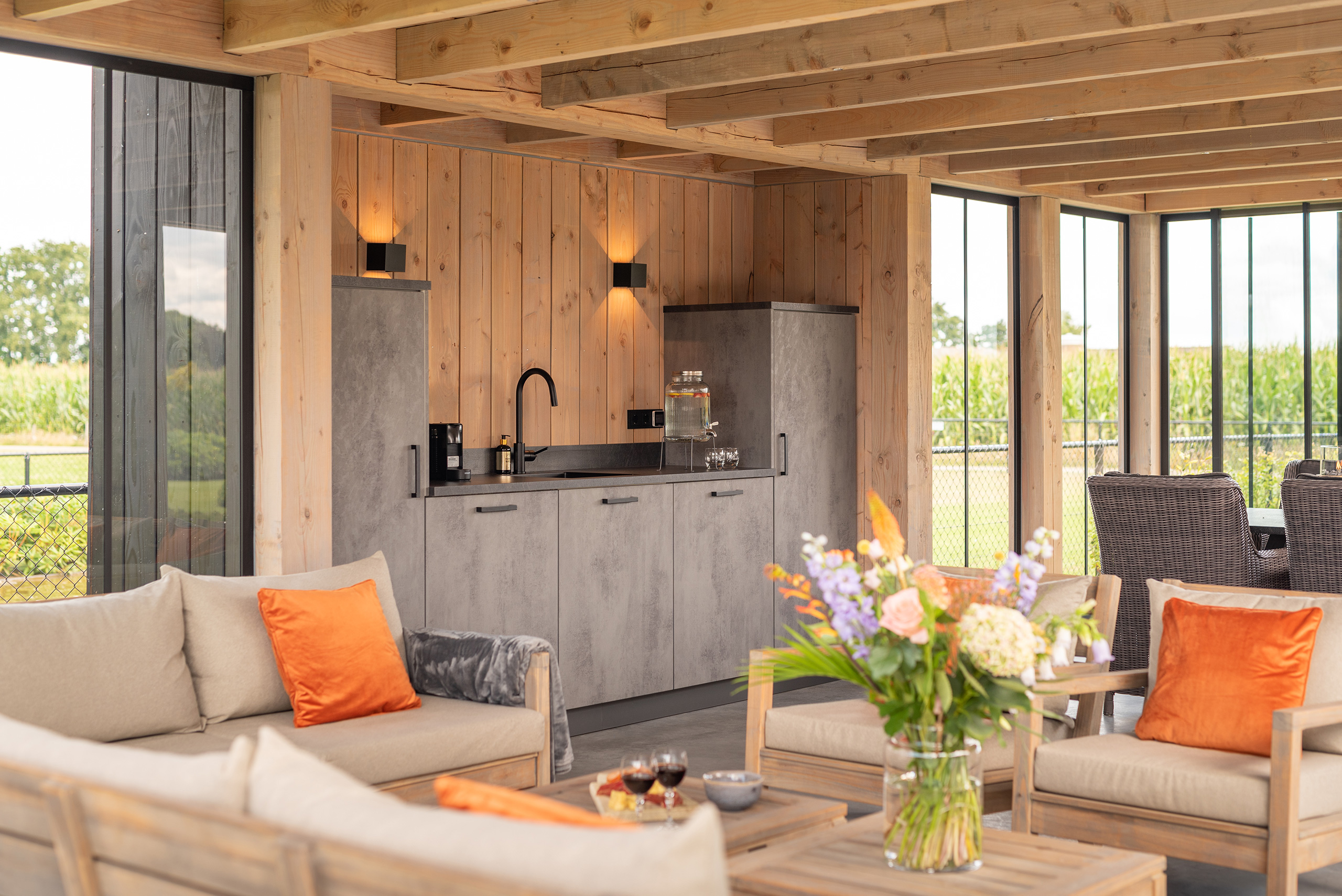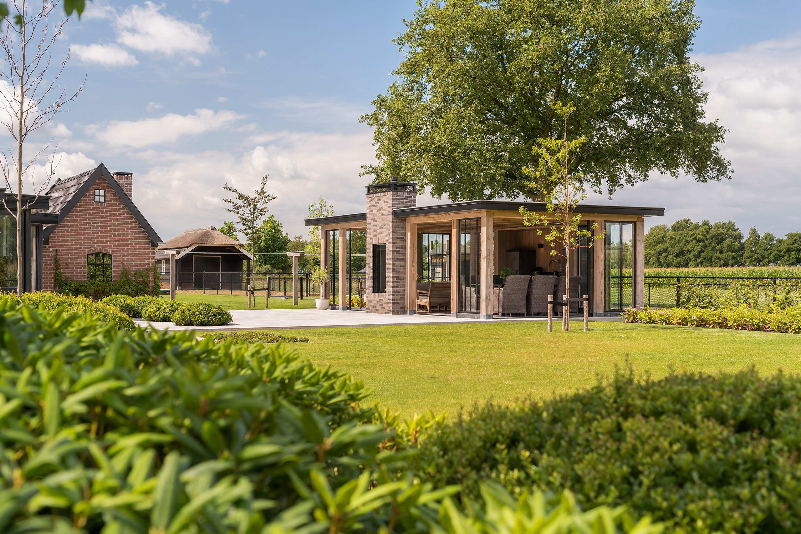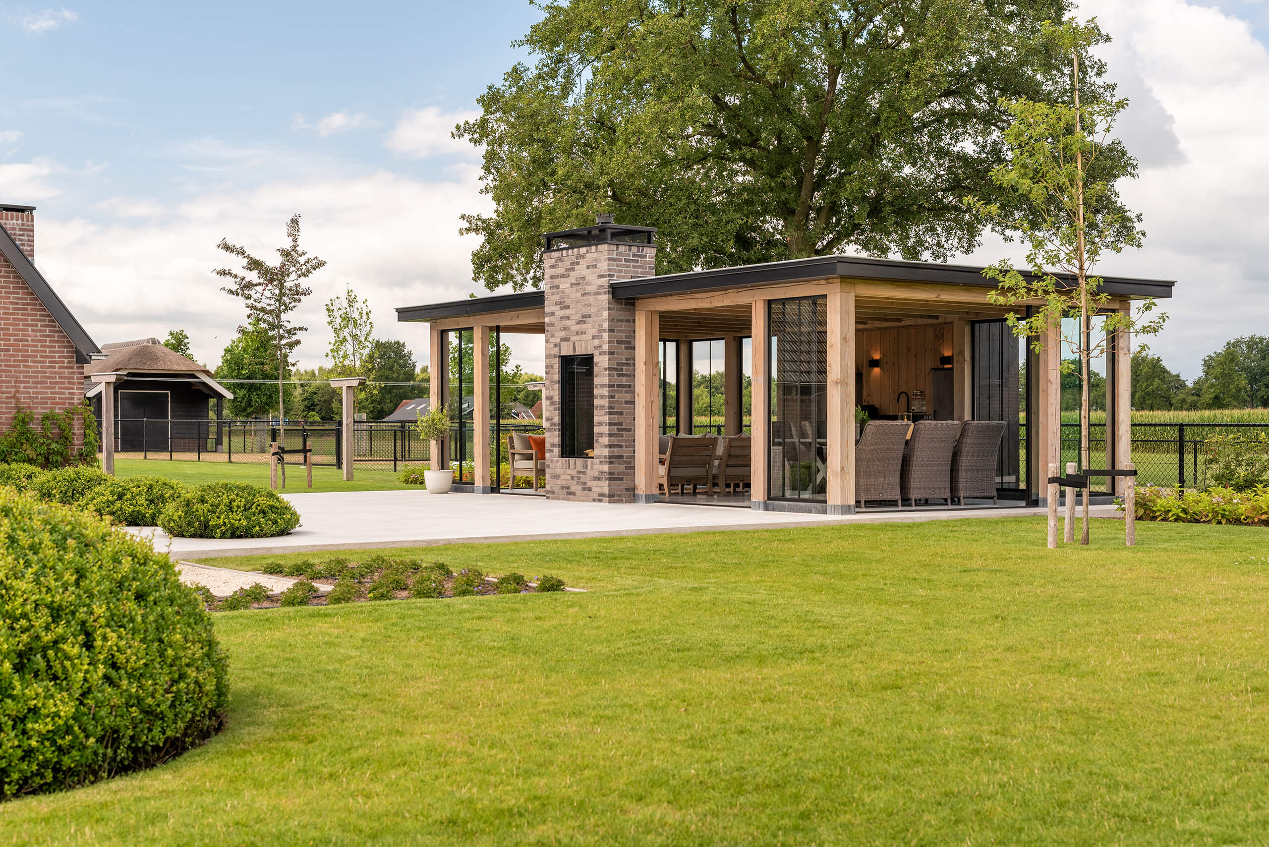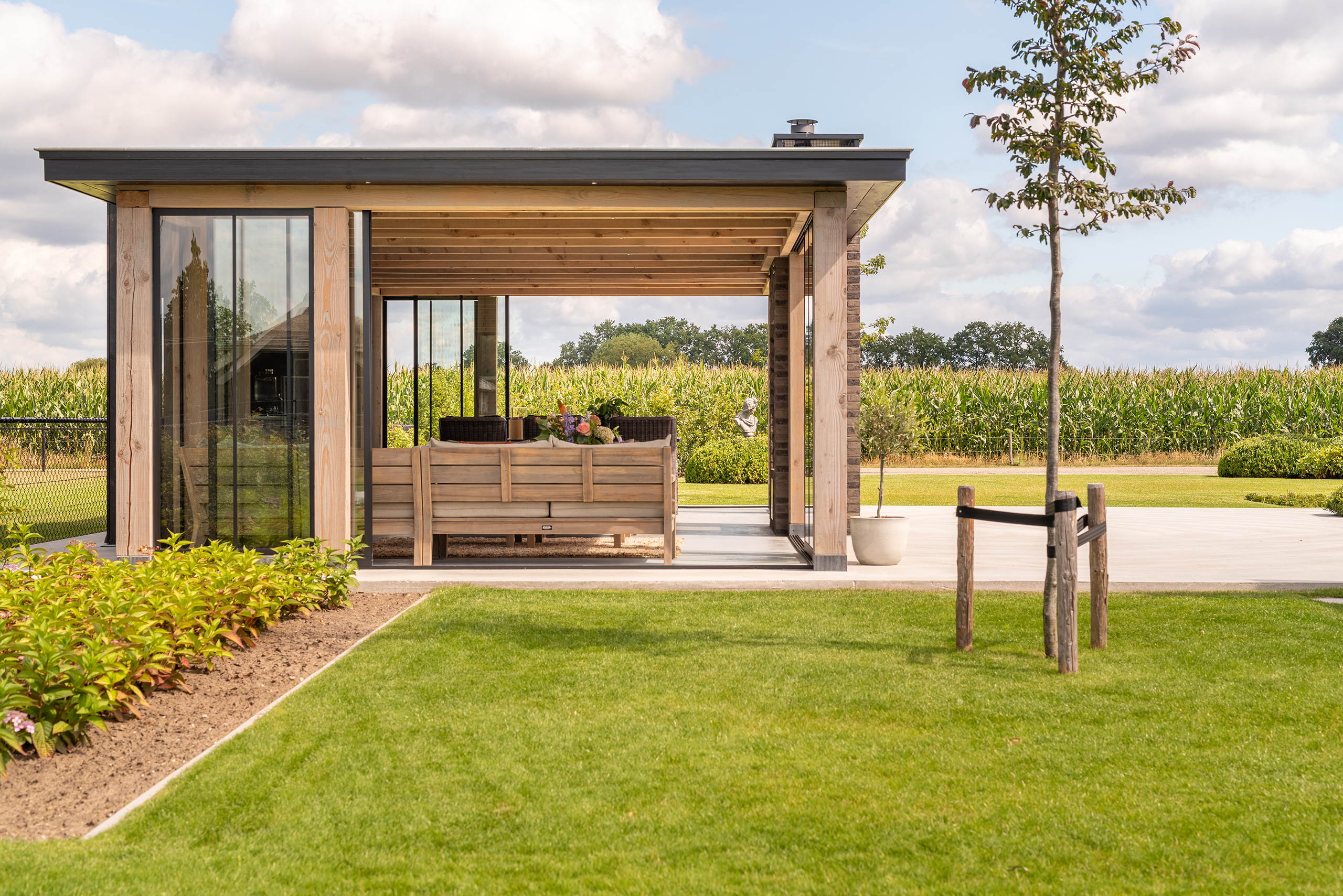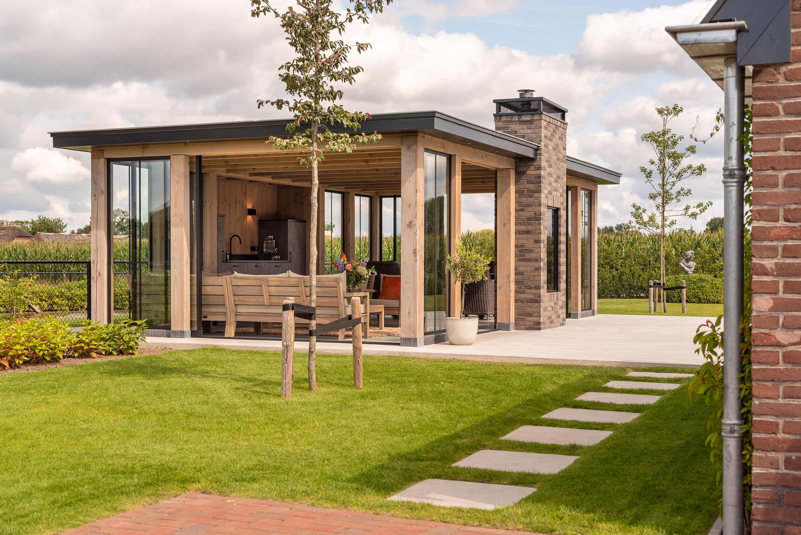 Deze tuinkamer is opgebouwd uit degelijke materialen met een eigentijdse uitstraling. Douglas hout vormt de basis waarbij de overstek in het zwart is uitgevoerd. Aan de achterzijde is een uitbouw gerealiseerd om de keuken een centrale plaats te kunnen geven.