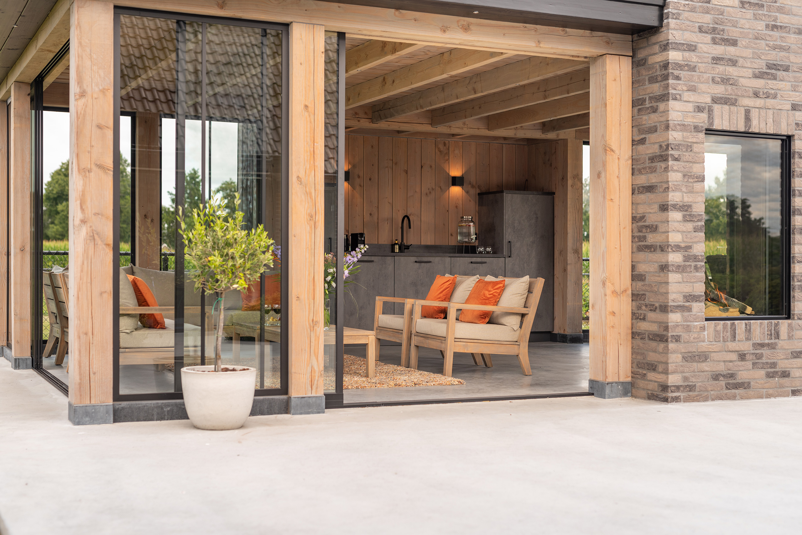 Mede door deze voorzieningen en de glazen deuren, uitgevoerd in verticaal staal, is deze tuinkamer daadwerkelijk elk seizoen te gebruiken. Op de warme zomerdagen schuift u de deuren volledig open en geniet u van een heerlijke bries. Op de koudere herfst of voorjaarsavond sluit u ze vanzelfsprekend om een beschutte plek te creëren.