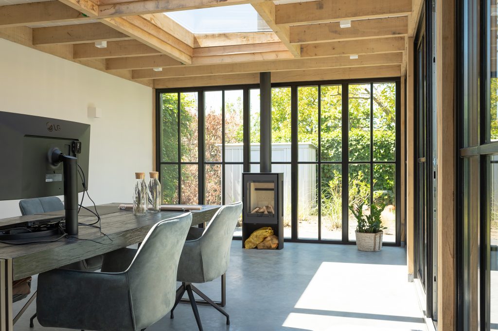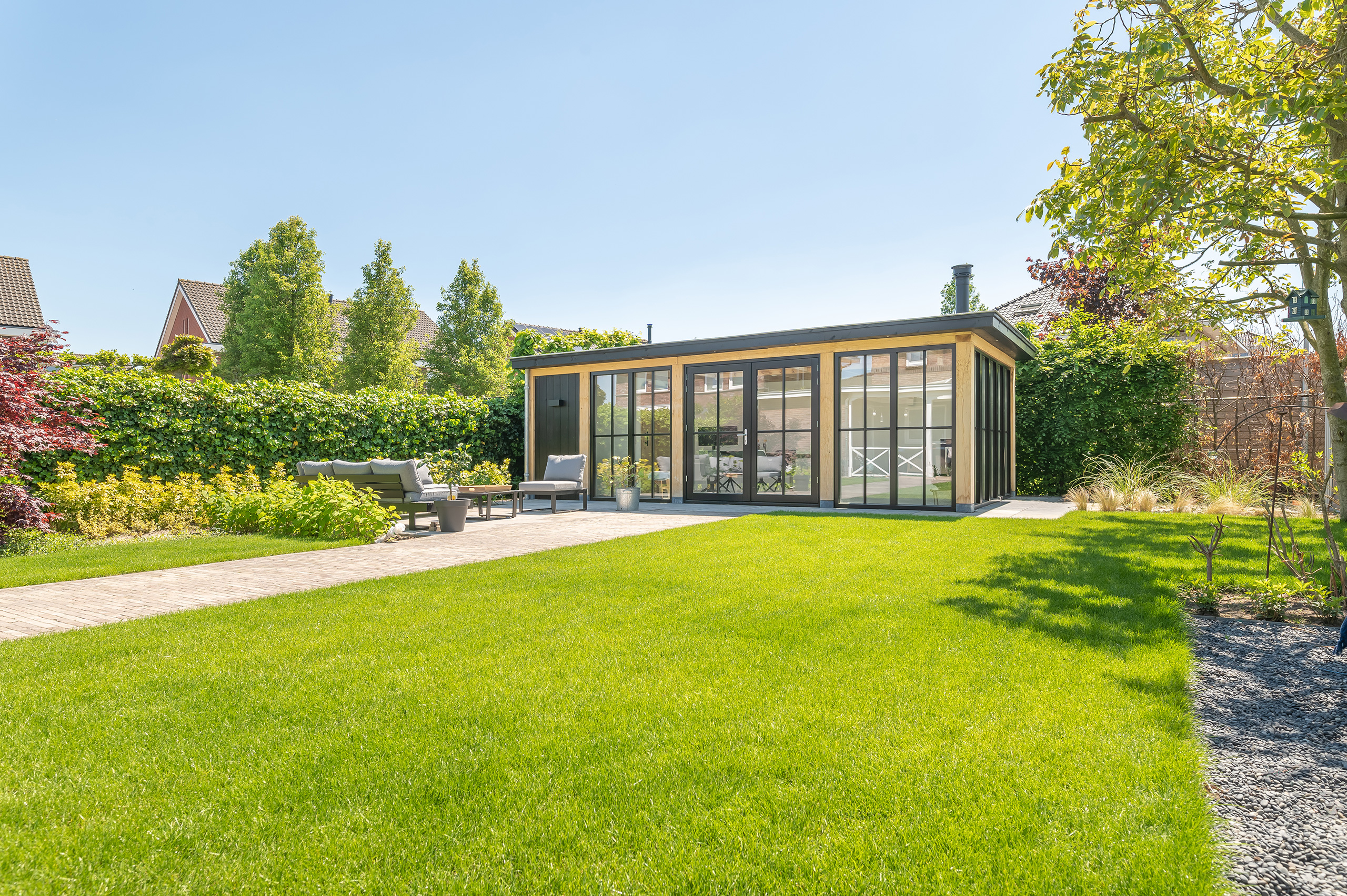 Een royaal tuinkantoor met berging om met meerdere mensen comfortabel te kunnen werken. Dat was de wens van deze ondernemer. Daarnaast is er genoeg ruimte om gasten te ontvangen in een aangenaam lounge gedeelte met uiteraard een heerlijke houtkachel. De fraai afgewerkte berging voegt praktisch gebruiksgemak aan het tuinkantoor toe.