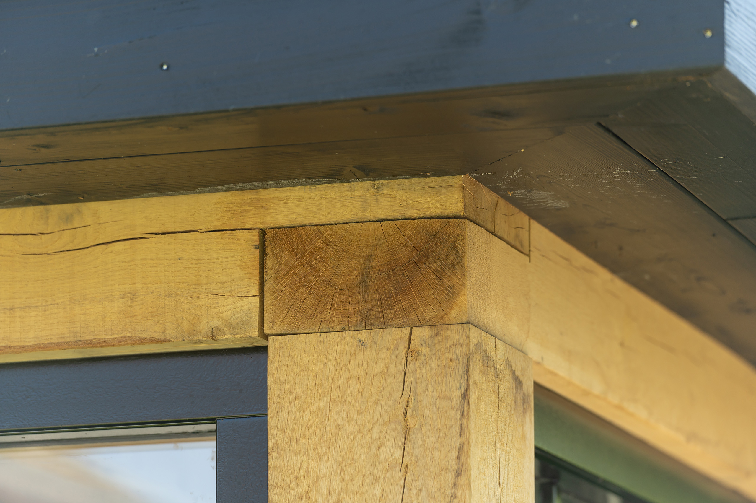 Het tuinkantoor is opgetrokken uit een volledig eikenhouten basis. Ook de degelijk samengestelde kozijnpartijen passen perfect in het verfijnde geheel van het maatwerk houten thuiskantoor.